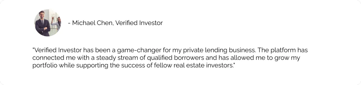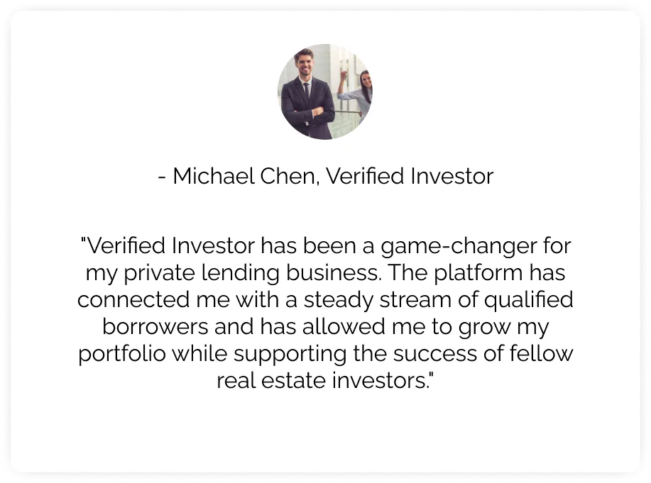 Disclaimer: A verified investor, as described here, is a real estate investor actively involved in purchasing real estate assets, including but not limited to mortgages or properties. It's important to note that a verified investor is distinct from an accredited investor, who meets specific criteria such as income, net worth, or professional experience, as defined by securities laws and regulations. The term 'verified investor' pertains specifically to real estate investing and should not be confused with the accreditation status required for certain investment opportunities.